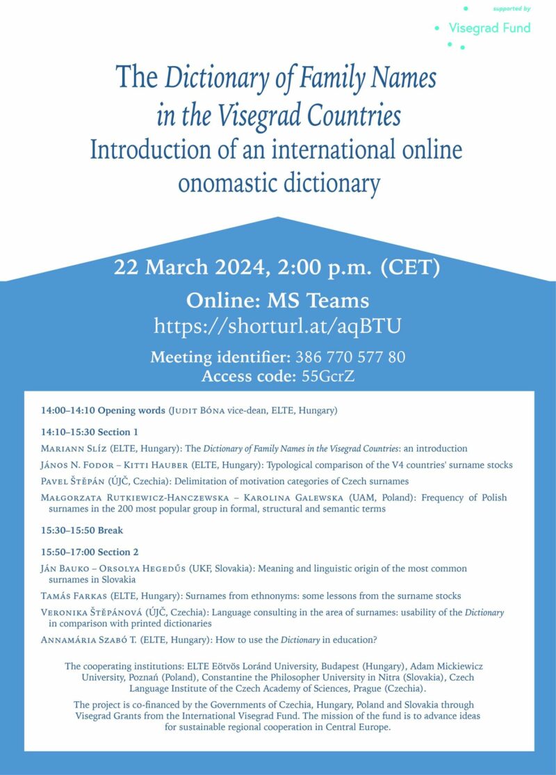 Dear all, On next Friday (22nd March 2024) there will be an online onomastic event, concerning an online dictionary and the study of family names of the so-called Visegrad countries (CZ, HU, PL, SK). The Dictionary of Family Names in the Visegrad Countries Introduction of an international online onomastic dictionary 22 March 2024, 2:00...