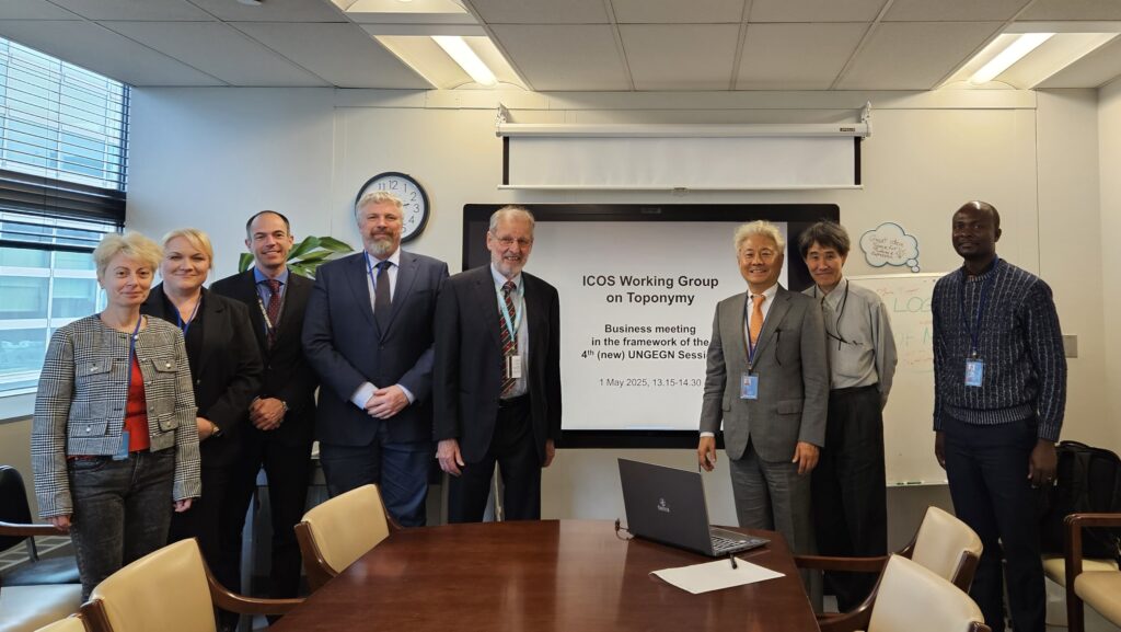 The ICOS Working Group on Toponymy met on 1 May 2025, at 13.15-14.30, during the 4th (new) UNGEGN Session in UN facilities nearby the UN Headquarter, New York, USA. The meeting had 8 participants: Andrea Bölcskei (Hungary), Osward Chanda Penda (South Africa), Sungjae Choo (Republic of Korea), Matjaž Geršič (Slovenia), Tiina Laansalu (Estonia), Kohei Watanabe (Japan), Maciej Zych (Poland), and Peter Jordan (Austria).