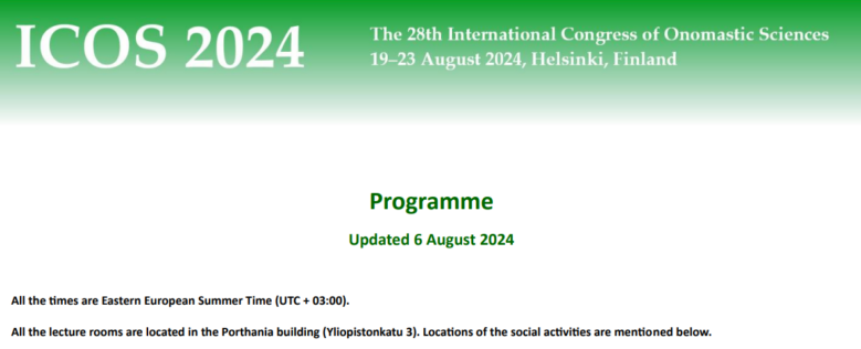 Dear colleagues and participants, Welcome to the 28th International Congress of Onomastic Sciences in Helsinki, Finland! This email includes important information about the Congress. Please read the post and the attachments through carefully! Fourth Circular Letter: Includes information on several topics, such as the venue, online participation, social events, etc. Updated programme: There have been some changes to...
